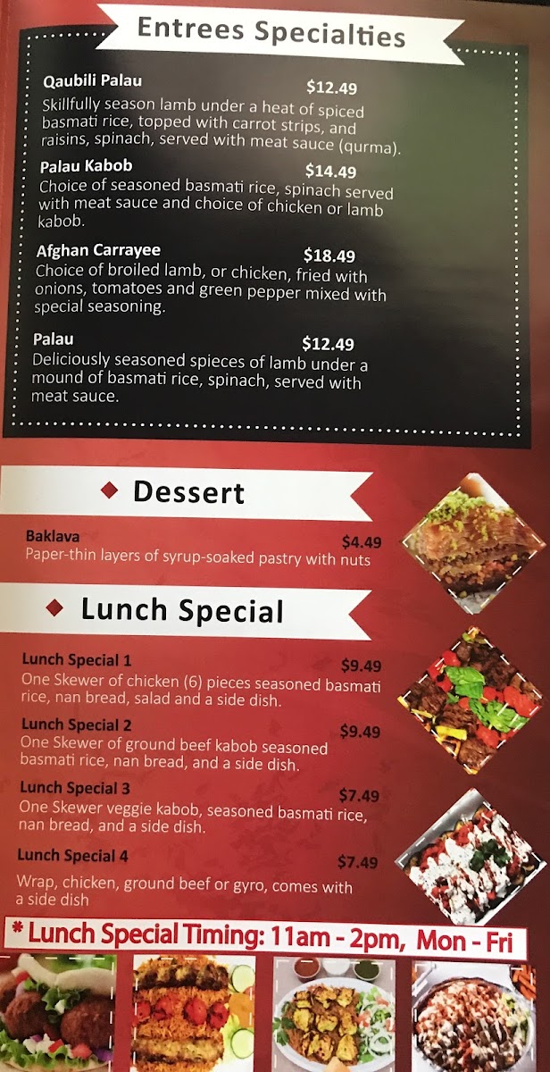 For those looking to explore the entrees, Afghan Carrayee and Qaubili PalauPalau are rich in flavor and offer a taste of authentic Afghan cuisine, while the Palau Kabob is a savory dish combining tender kabobs with seasoned rice. The Vegetarian Dish and Veggie Kabob cater to plant-based diners, providing a healthy and flavorful alternative.