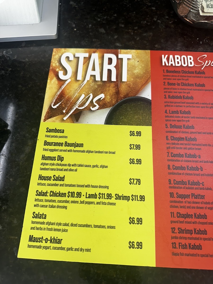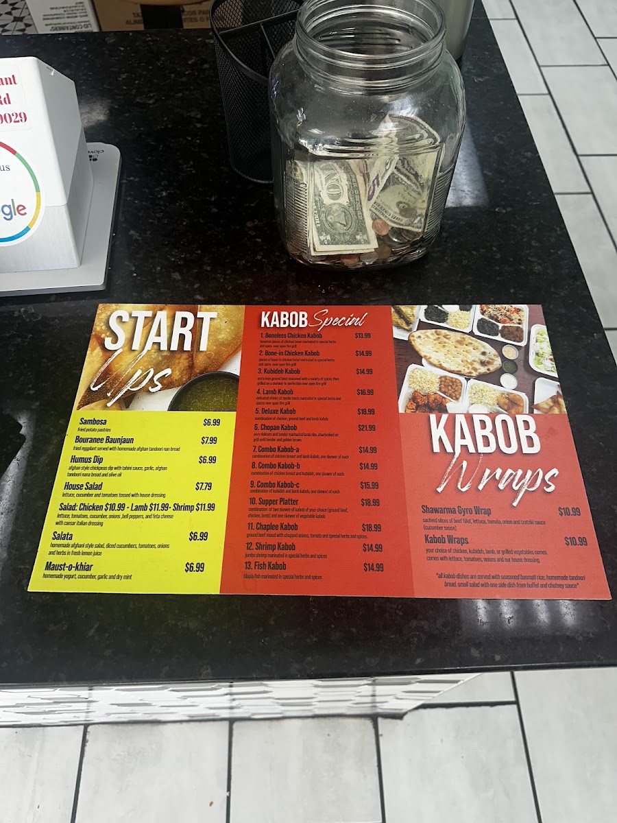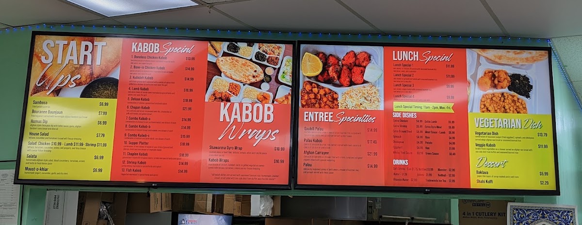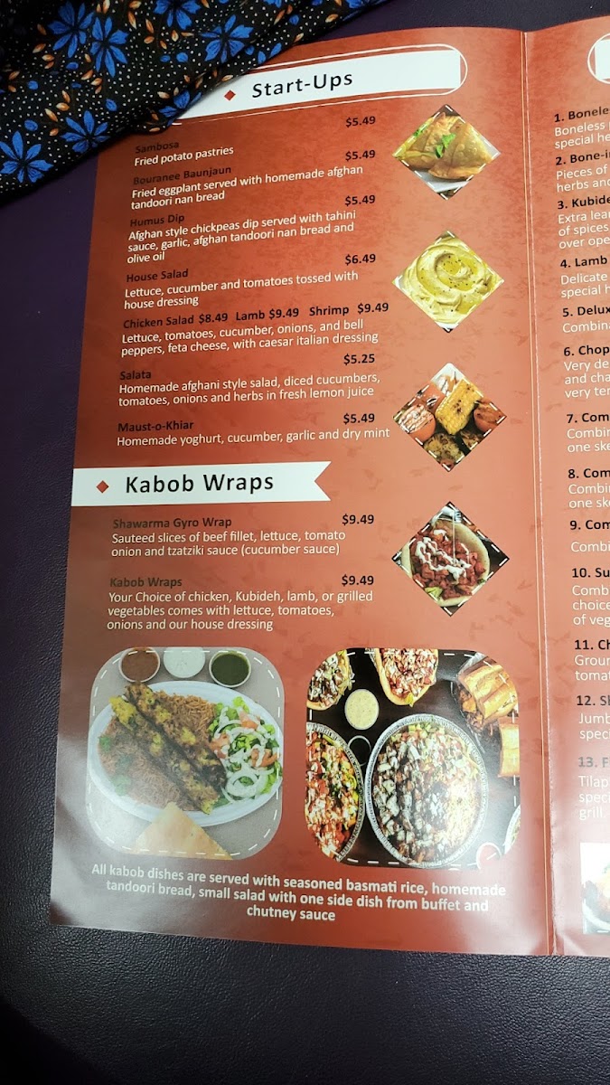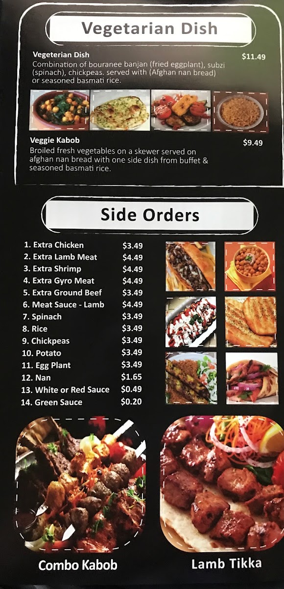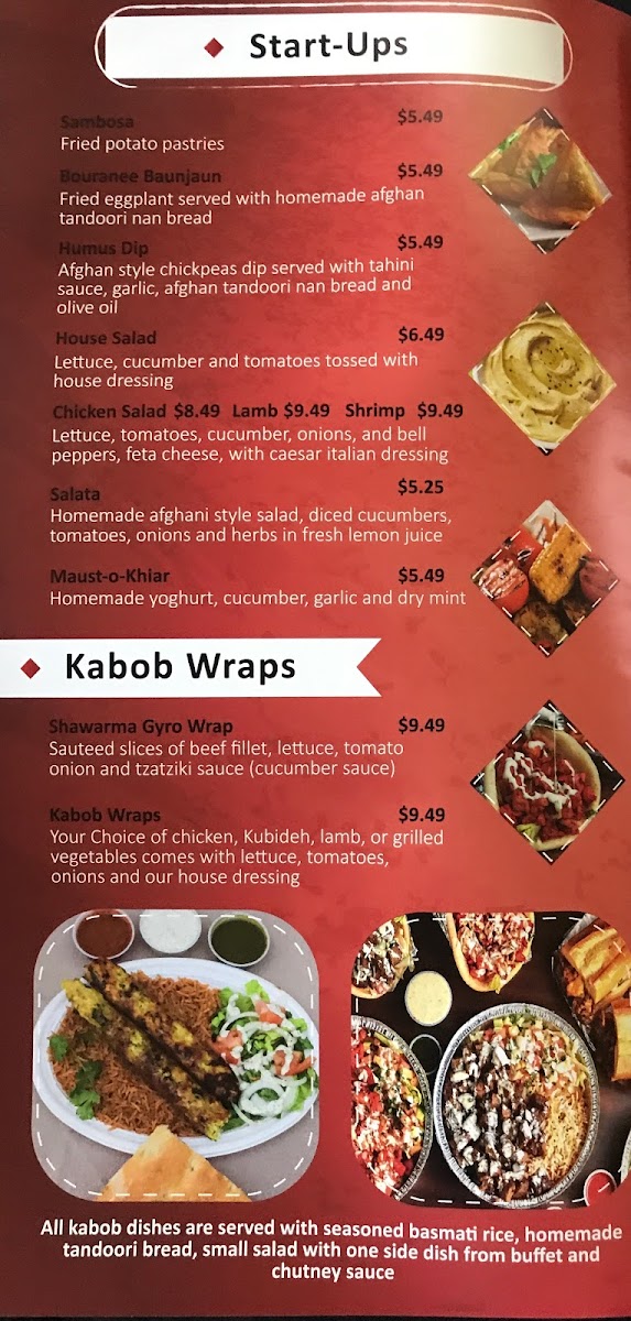 Kabob Restaurant offers a diverse and flavorful menu that combines traditional Afghan dishes with a modern twist. The menu caters to various tastes, from hearty Kabob wraps to indulgent family meals and refreshing beverages. One of the standout items is the Shawarma Gyro Wrap, a delicious fusion of Middle Eastern flavors, as well as the classic Kabob Wraps, both offering savory fillings wrapped in soft pita. For those seeking a more substantial meal, the Family Meal options are perfect, with choices like the 6-7 People Meal and the 5-6 People Meal, which come with an assortment of kabobs, sides, and salads ideal for sharing.