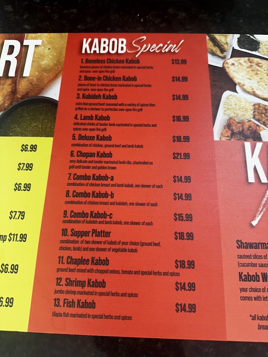 For a true Kabob experience, the Kabob Special offers a variety of meat options, including the Bone-In Chicken Kabob, Kubideh Kabob, Lamb Kabob, and even Fish Kabob. The Combo Kabob-C gives you the chance to try multiple flavors in one dish. To finish off your meal, enjoy a sweet treat like Baklava or Shahi Kulfi, both deliciously rich in flavor.